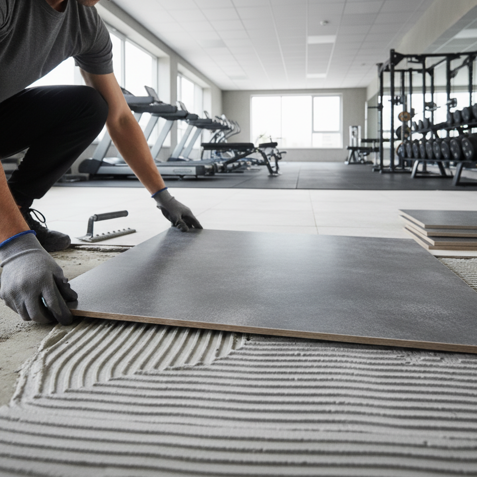 Instalación de loseta en pasillos y vestidores. El adhesivo permitió colocación segura en superficies existentes (piso sobre piso), con excelente adherencia y sin desprendimientos pese a impacto y vibración diarios.