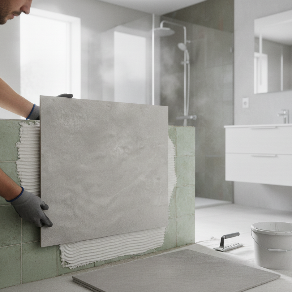Renovación sin demoliciones en áreas húmedas. El pegamento aseguró un acabado limpio y duradero, resistente a salpicaduras y cambios térmicos, reduciendo tiempos y escombros en la obra.
