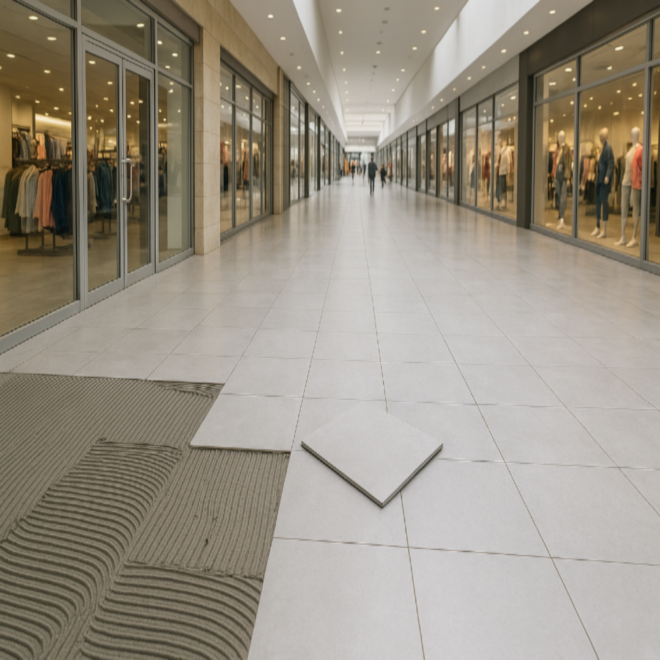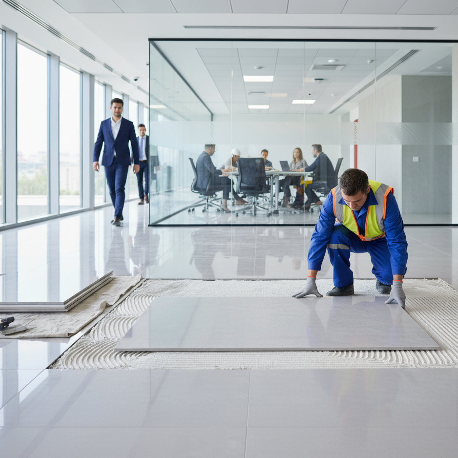 Colocación de porcelanato rectificado en lobby y zonas comunes. Alta adherencia y mínimo deslizamiento para juntas uniformes y una entrega rápida, sin interrumpir operaciones por mucho tiempo.
