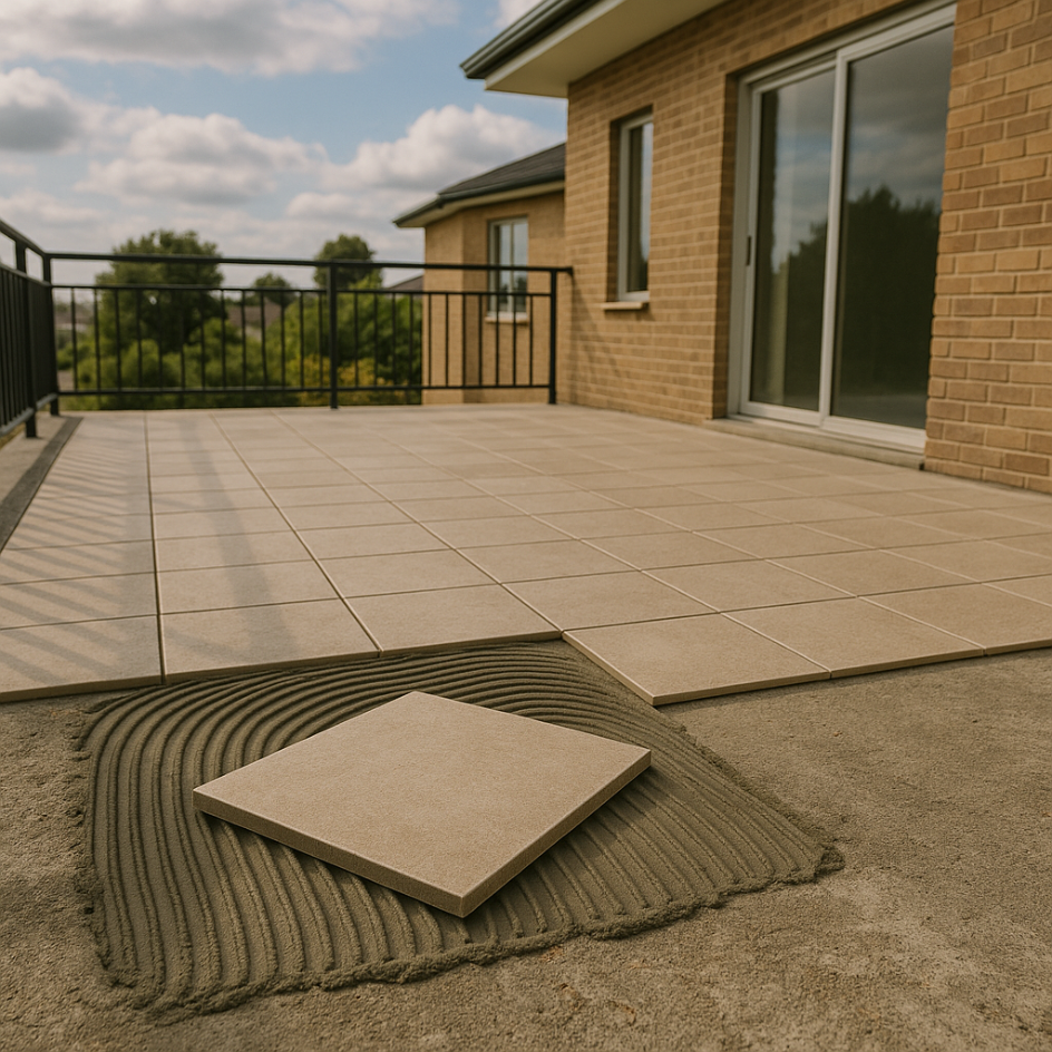 Colocación de piso cerámico sobre concreto expuesto. El adhesivo ofreció alta resistencia a la intemperie y a los cambios térmicos, asegurando una superficie estable, sin filtraciones ni levantamientos, perfecta para exteriores.
