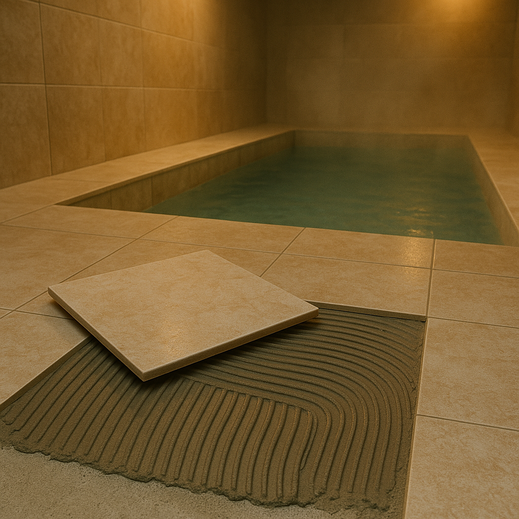 Colocación de cerámica y mármol en baños y áreas de spa. El pegamento mantuvo una adherencia firme en condiciones de humedad y vapor, logrando un acabado uniforme, duradero y estéticamente impecable, ideal para espacios de uso continuo.